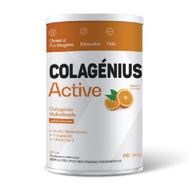 Colagénius Active Laranja é um suplemento alimentar em pó à base de Colagénio, Ácido hialurónico, Magnésio, Vitamica D e Vitamina C.